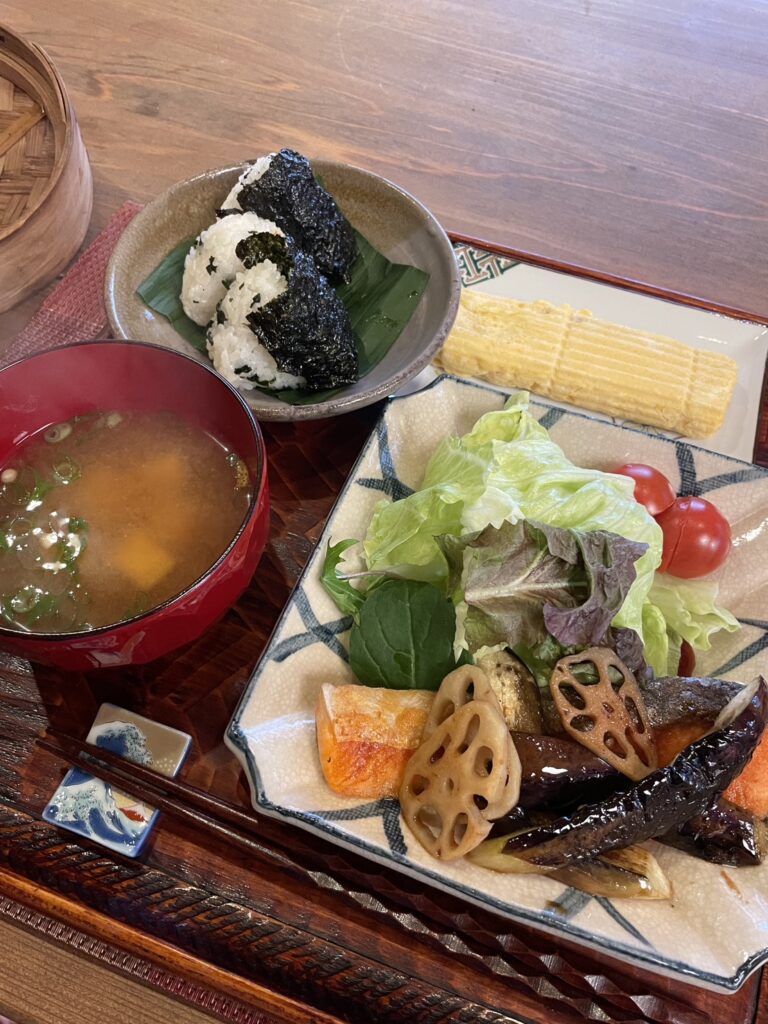 大好きな鮭、新鮮なサラダ、お味噌汁とおむすび、